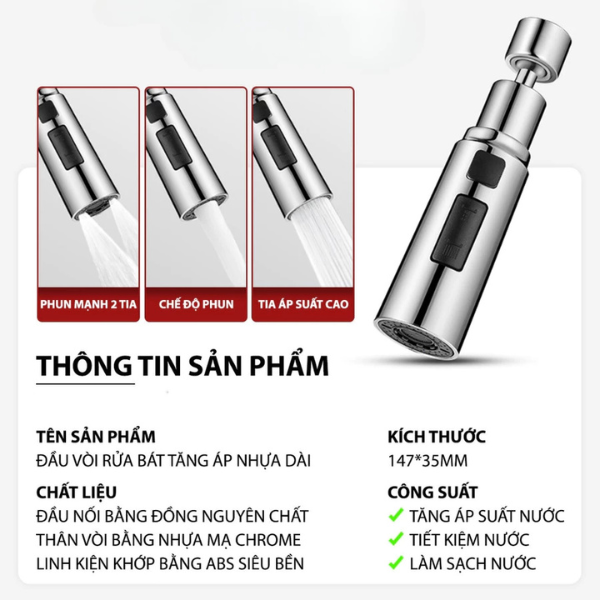 Mình mua để gắn cho bồn rửa bát trong bếp, cảm giác áp lực nước mạnh hơn gấp đôi, rửa bát nhanh hơn nhiều, mà không lo nước bắn ra ngoài.