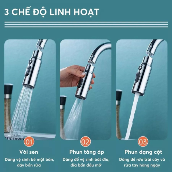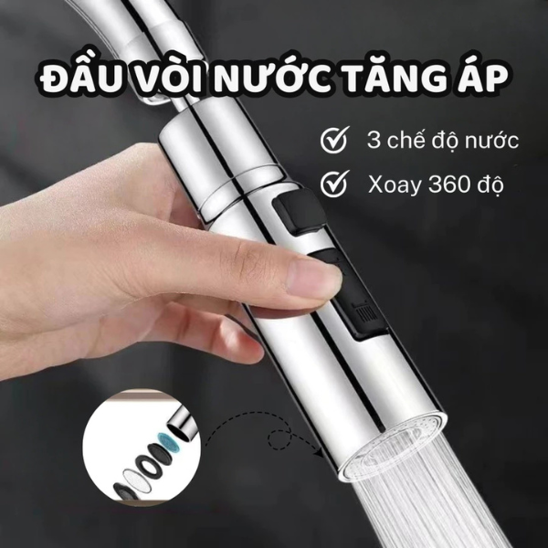 Đầu vòi tăng áp chống văng nước cao cấp 03 chế độ phun là sản phẩm cải tiến mới nhất giúp bạn tối ưu hiệu suất sử dụng nước mà vẫn đảm bảo tính thẩm mỹ cho không gian bếp.